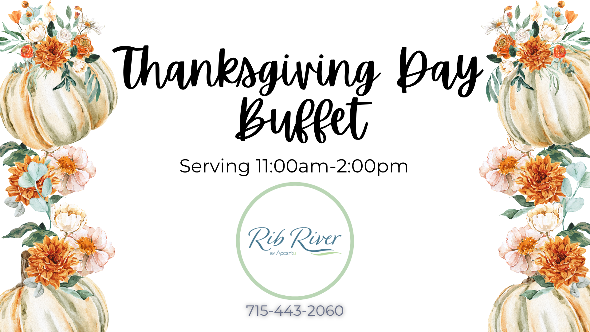 Thanksgiving Day Buffet!  Come join us for our Thanksgiving Day Buffet! Serving 11:00am-2:00pm. Reservations required. Adults: $20.99 6-12 Years: $12.99 3-6 Years: $8.99 Under 3: Free Pay at the door. Call (715) 443-2060 to make a reservation.